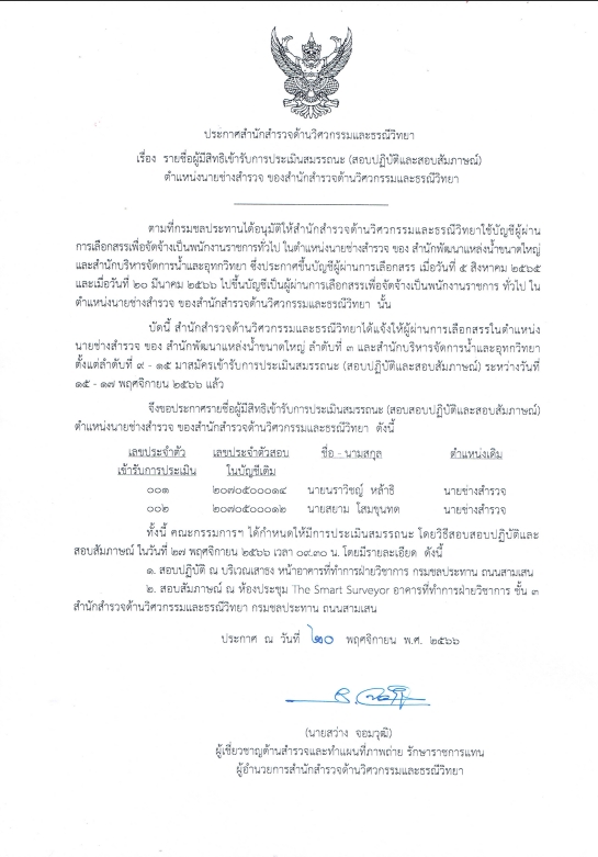 ประกาศรายชื่อผู้มีสิทธิเข้ารับการประเมินสมรรถนะ (สอบปฎิบัติและสอบสัมภาษณ์) ตำแหน่งนายช่างสำรวจ ของสำนักสำรวจด้านวิศวกรรมและธรณีวิทยา
